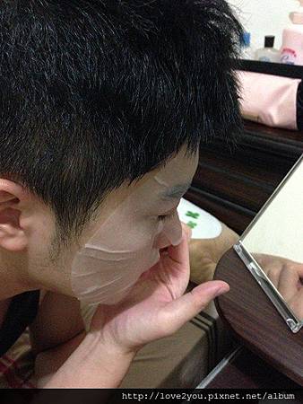 瞧有人專心的照照鏡子 微調著面膜的角度