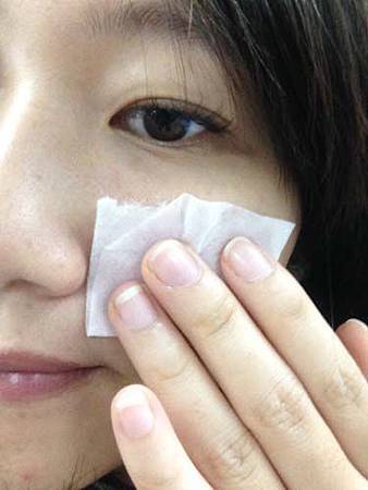 於是我將沾滿化妝水的化妝棉輕輕地濕敷於兩頰處