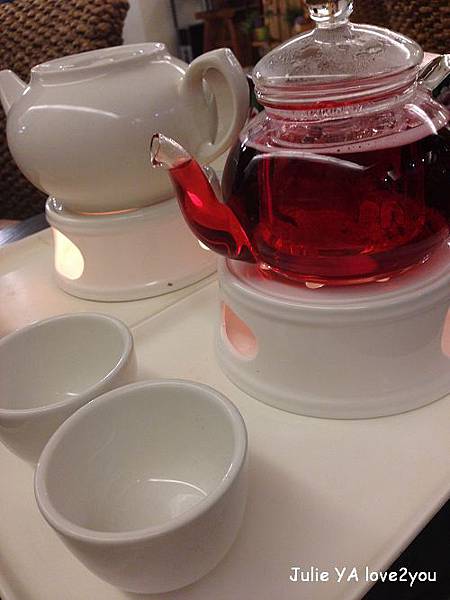 我喝的是洛神花茶 是真的洛神花去沖泡的 看得到 喝起來真的很香甜