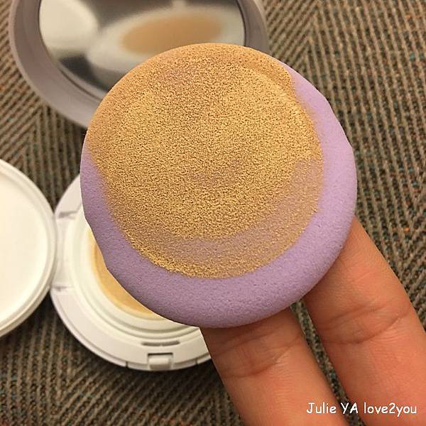 紫色的粉撲沾染上結合妝前乳與粉底的氣墊階餅