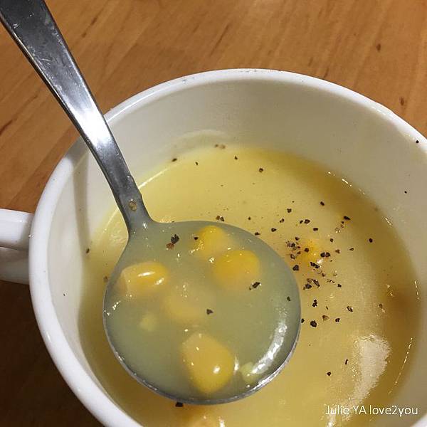 只有在玉米濃湯上灑上粗黑胡椒,讓湯品更香