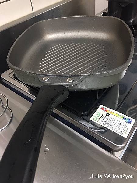 洗好的牛排鍋,乾淨地放回瓦斯爐
