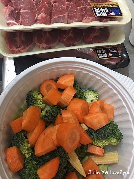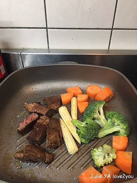 除了牛排,當然還有蔬菜:花椰菜、紅蘿蔔、玉米筍