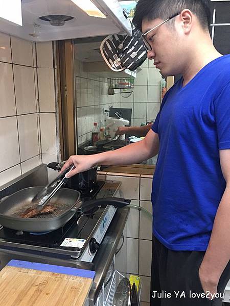 型男主廚還很帥氣地插口袋單手煎牛排…