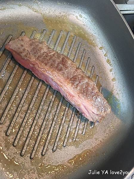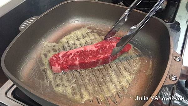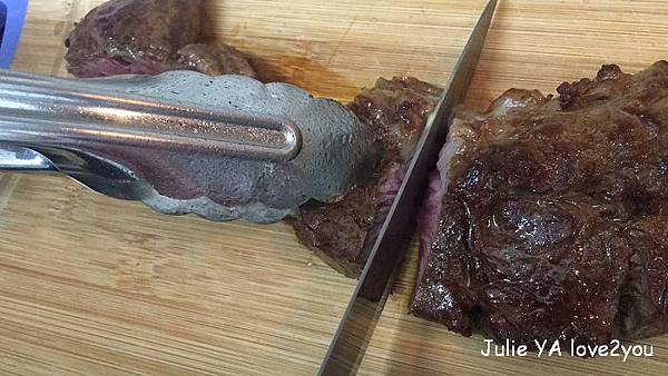 因為使用中小火,可以慢慢地觀察牛排的熟度
