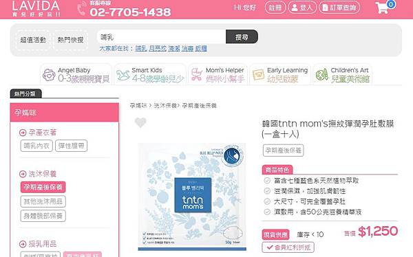 在「洗沐保養」→「孕期產後保養」→「韓國tntn mon's撫紋彈潤孕肚敷膜」(一盒十入)