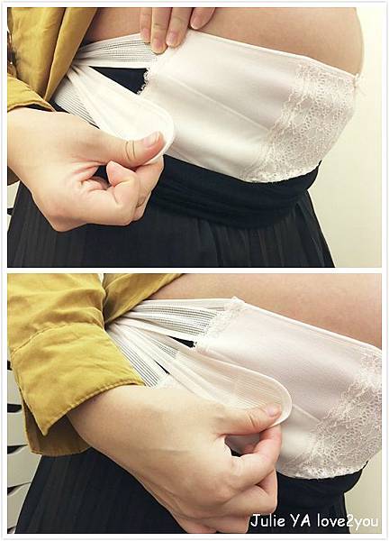 接著把托腹帶一頭穿過、黏好,兩邊就有交叉