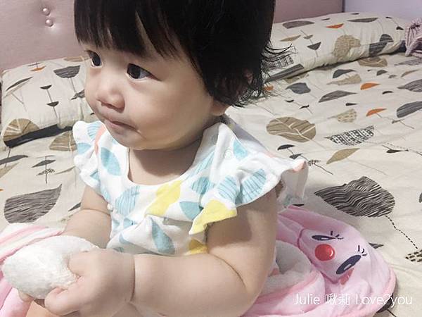 在幫小荳荳擦上乳液時 還不想把帽子脫下來