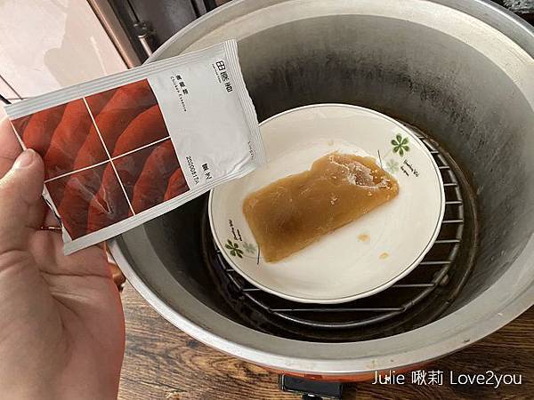 剪開鋁箔袋,將冷凍雞精塊倒入碗中