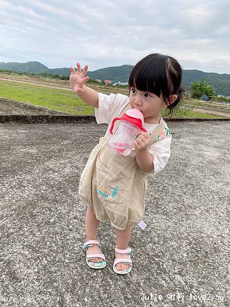 換裝完,也別忘了補充水分 像她老爸招手… 完全就是個萌娃