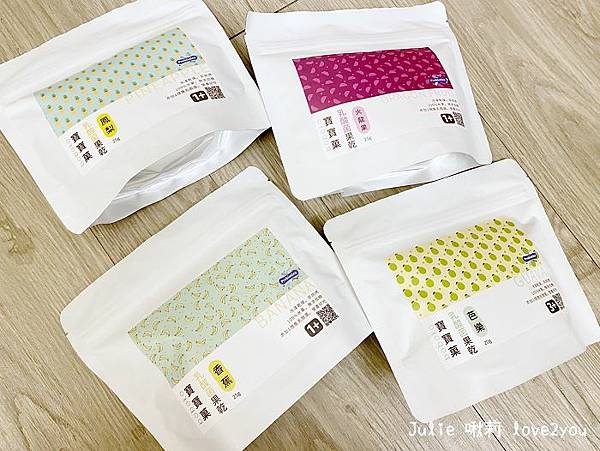 寶寶果乾擁有不同口味:香蕉、鳳梨、火龍果、芭樂