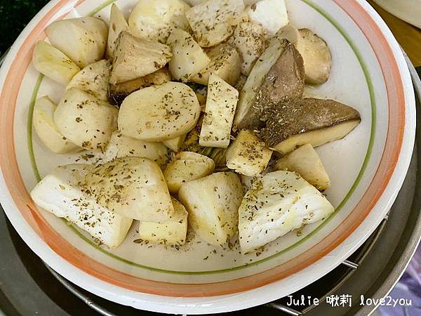 電鍋裡我除了煮飯,上面還放了這一盤杏鮑菇