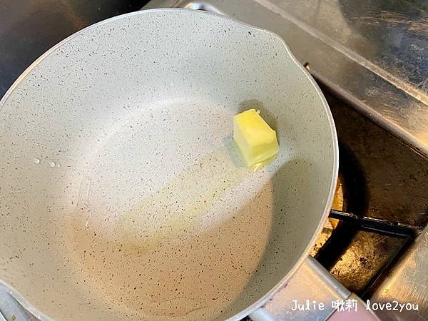 先把奶油在鍋中融化 接著把切成不規則大小的杏鮑菇放入拌一拌
