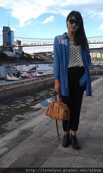 因為天氣不錯 以耐看 百搭的長版襯衫當作外套 (牛仔襯衫是女孩們必備的單品之一唷)
